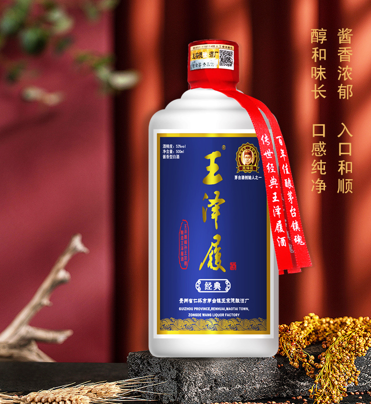 品 名: 王泽履酒 经典蓝 原 料: 高粱、小麦、水 香 型: 酱香型 执行标准: GB/T26760-2011(优级) 酒精度: 53%vol 净含量 : 500ml/瓶 酒 体: 5年基酒(85...