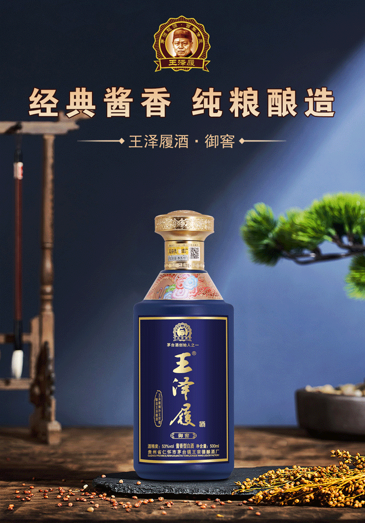 品 名: 王泽履 名酱 原 料: 高粱、小麦、水 香 型: 酱香型 执行标准: GB/T26760-2011(优级) 酒精度: 53%vol 净含量: 500ml/瓶 酒 体: 5年基酒(80%)+10年...