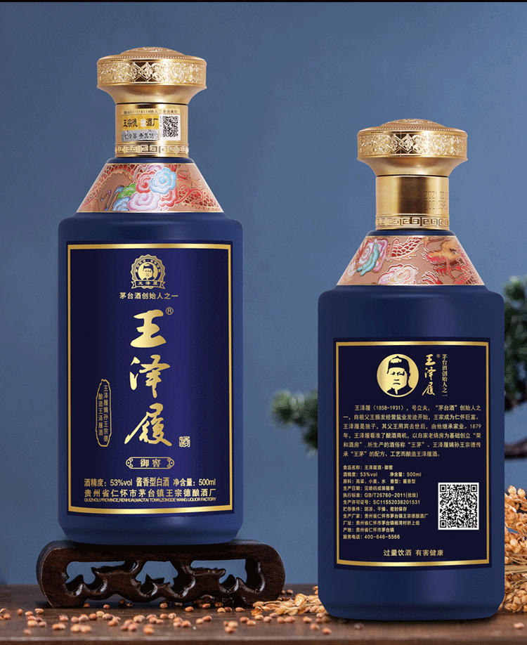 品 名: 王泽履酒 经典蓝 原 料: 高粱、小麦、水 香 型: 酱香型 执行标准: GB/T26760-2011(优级) 酒精度: 53%vol 净含量 : 500ml/瓶 酒 体: 5年基酒(85...